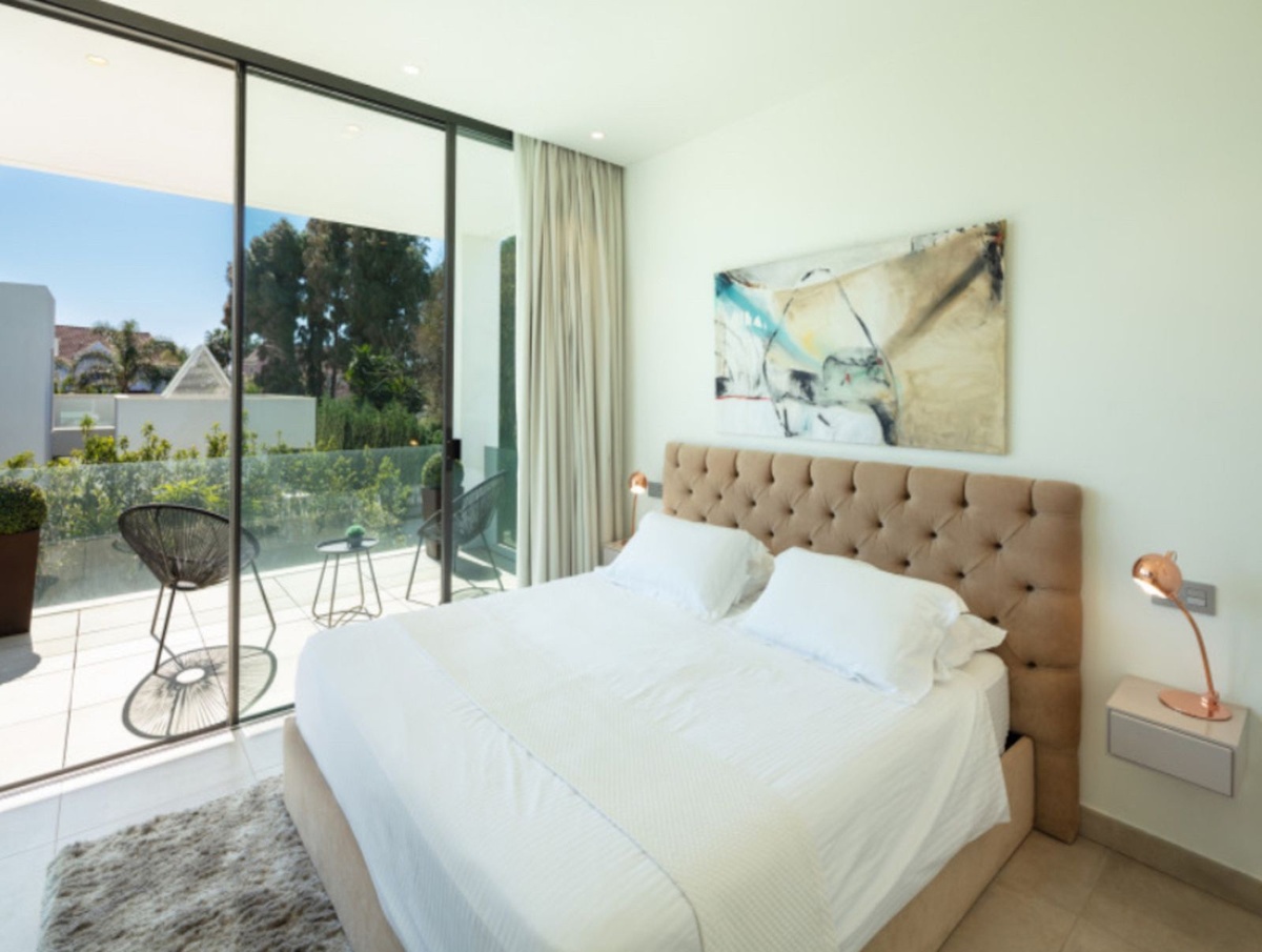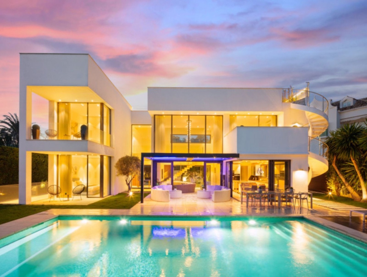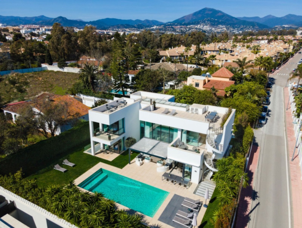 This contemporary villa provides the ultimate in beach side luxury living. Located in the beautiful beachside resort of Puerto Banus, 200 meters walking distance to the beach, close to shops and nightlife of Puerto Banus and short driving distance from Marbella centre and San Pedro. Designed across 3 floors, all accessible through the private elevator, the property offers 7 bedrooms and 7 bathrooms each with an outdoor terrace. Entrance level boasts of a large airy open plan living with double height ceilings. Welcoming exteriors include a manicured garden which surrounds the 54m2 salt water heated pool, cosy lounge areas, an outdoor dining area completed with its own outdoor kitchen and BBQ area for al fresco dining. On the first floor you will find 3 en-suite bedrooms and a hanging gallery overlooking the impressive lounge area. The generous master suite is completed with a walk-in shower, stand alone bath and an expansive walk-in wardrobe. A large outdoor sun terrace overlooks the pool and garden with access to the roof terrace. An expansive area with 3 separate terraces, giving you even more options for sunbathing and dining, while enjoying the breathtaking Sea and Mountain views. The basement has been converted into the perfect relaxation area, equipped with a cinema room and a games lounge.
