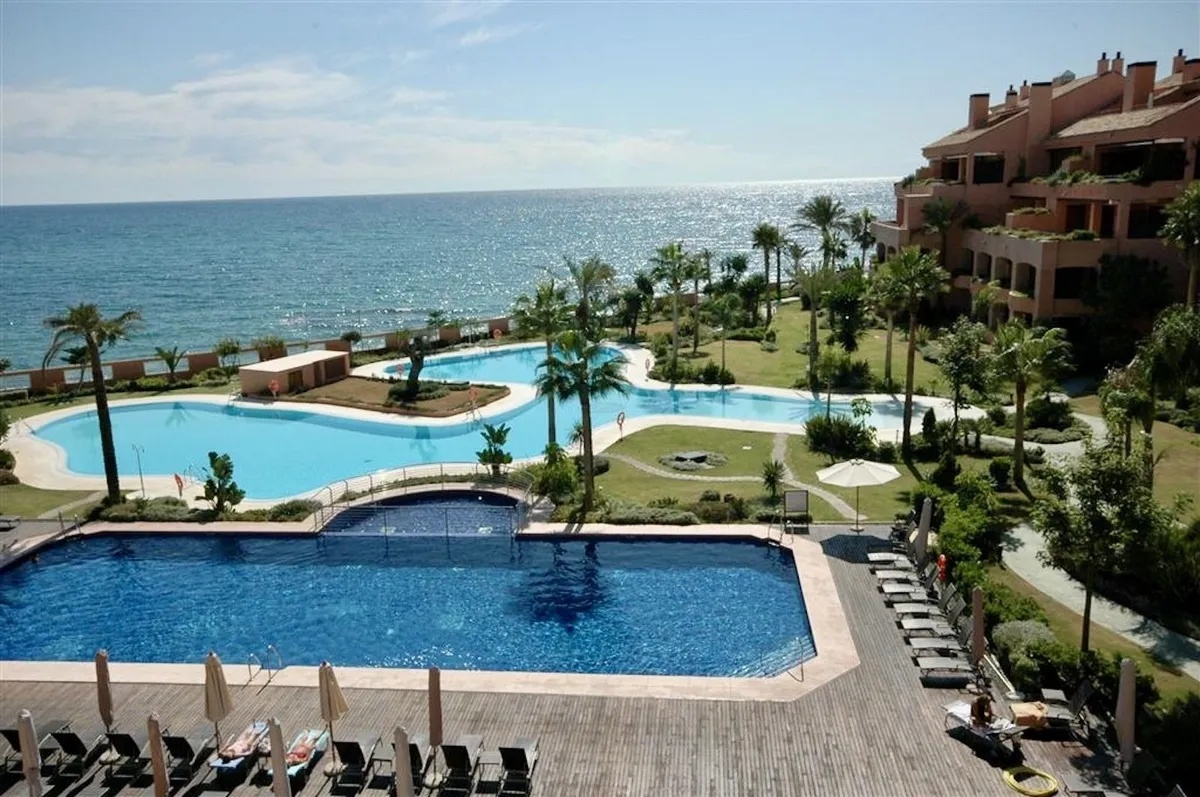 Beautiful Luxury ground floor apartment in one of the best beachfront developments with 360° panoramic views. Malibu is an exclusive residential complex consisting of 72 modern and elegant apartments with fantastic views of the Mediterranean. Complex offers a high level of safety, comfort and service, as well as a unique design and a prime location. The contemporary and luxuriously decorated apartment is distributed by a spacious entrance hall, a fully equipped modern kitchen with a separate utility room. An elegant living area with direct access to the terrace. From the terrace there is an access to the private garden and communal swimming pool. In addition, there are two bedrooms with en-suite bathrooms and fitted wardrobes. The underground garage is easily accessible with its two parking spaces and storage. The Malibu gated complex is located on the front line of one of the best sandy beaches in Puerto Banús. Complex has a large saltwater pool, a freshwater pool, SPA with sauna & hammam, a gymnasium, concierge and beautiful garden with waterfalls & tropical plants. The complex is equipped with modern security cameras, 24-hour security checkpoint. Close to Mistral beach, Puerto Banus and just a few meters from the 5-star Guadalpin Banus hotel. Close to international schools, wide variety of shops, restaurants, bars and activities.