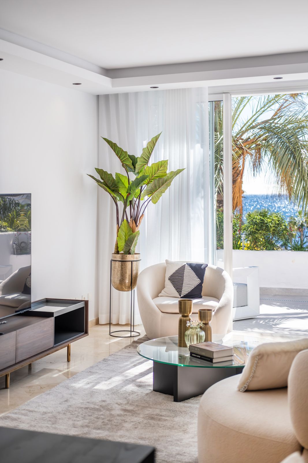 EXCLUSIVO Penthouse dúplex del sur con vistas al mar frontal en Ventura del Mar, uno de los desarrollos más prestigiosos frente al frente de la playa en Puerto Banus, Marbella. Ventura del Mar es uno de los desarrollos frente a la playa más prestigiosos y mejor ubicados en Marbella ... a tiro de piedra de Puerto Banús, pero muy tranquilo. El complejo de lujo ofrece seguridad y privacidad, jardines tropicales bien mantenidos y ajardinados con corrientes y estanques, una gran piscina al aire libre, un área y un área relajante con gimnasio, así como acceso directo al paseo marítimo y la playa. Apartamentos espaciosos y de lujo en un complejo de primer nivel junto al mar ... ¡un paseo de Puerto Banús y con todo lo que necesitas a tu mano! El complejo ofrece 24 horas de seguridad, famosos jardines tropicales ajardinados con arroyos y estanques, una gran área de piscina comunitaria, un gimnasio (sauna, baño de vapor, duchas) un juego y asientos, área relajante y área de oficina. Acceso directo al paseo marítimo y la playa. La propiedad ha sido amueblada a los más altos estándares, con una cocina de lujo totalmente equipada y de lujo con isla, que se conecta a una espaciosa sala de estar, frente a una terraza sur con vistas abiertas, con vistas a los jardines tropicales y al mar. Dos habitaciones en el piso principal con dormitorios de tamaño king, uno con baño de suite y acceso directo a la terraza sur con vistas panorámicas. Dormitorio principal de arriba con vestidor y en suite de baño grande. El dormitorio principal tiene acceso directo a dos amplias terrazas superiores. Una de las terrazas de South Top tiene un área de barbacoa y un área para tomar el sol con un jacuzzi de lujo. Las vistas desde aquí son impresionantes y con vistas a los jardines tropicales con características de agua y el mar. La otra terraza se enfrenta a la famosa montaña, La Concha. La propiedad cuenta con pisos de mármol y baldosas de baño, con calefacción de piso. También se beneficia de aire acondicionado (caliente y frío) en todo momento. Hay fibra óptica, Internet de banda ancha y Wifi en todo el apartamento con LED Smart TV 75¨. 2 espacios de estacionamiento subterráneos y almacenamiento incluidos subterráneos al lado del estacionamiento. *Lista de todos los muebles que se incluirán.