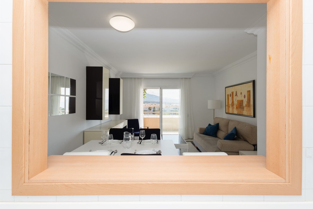 Al entrar, te recibe un salón espacioso y luminoso con sofás, butacas y smart TV. Desde aquí, tienes acceso directo a una terraza privada amueblada con mesa para 6 comensales, ideal para disfrutar de increíbles vistas al mar de Alborán y las montañas.