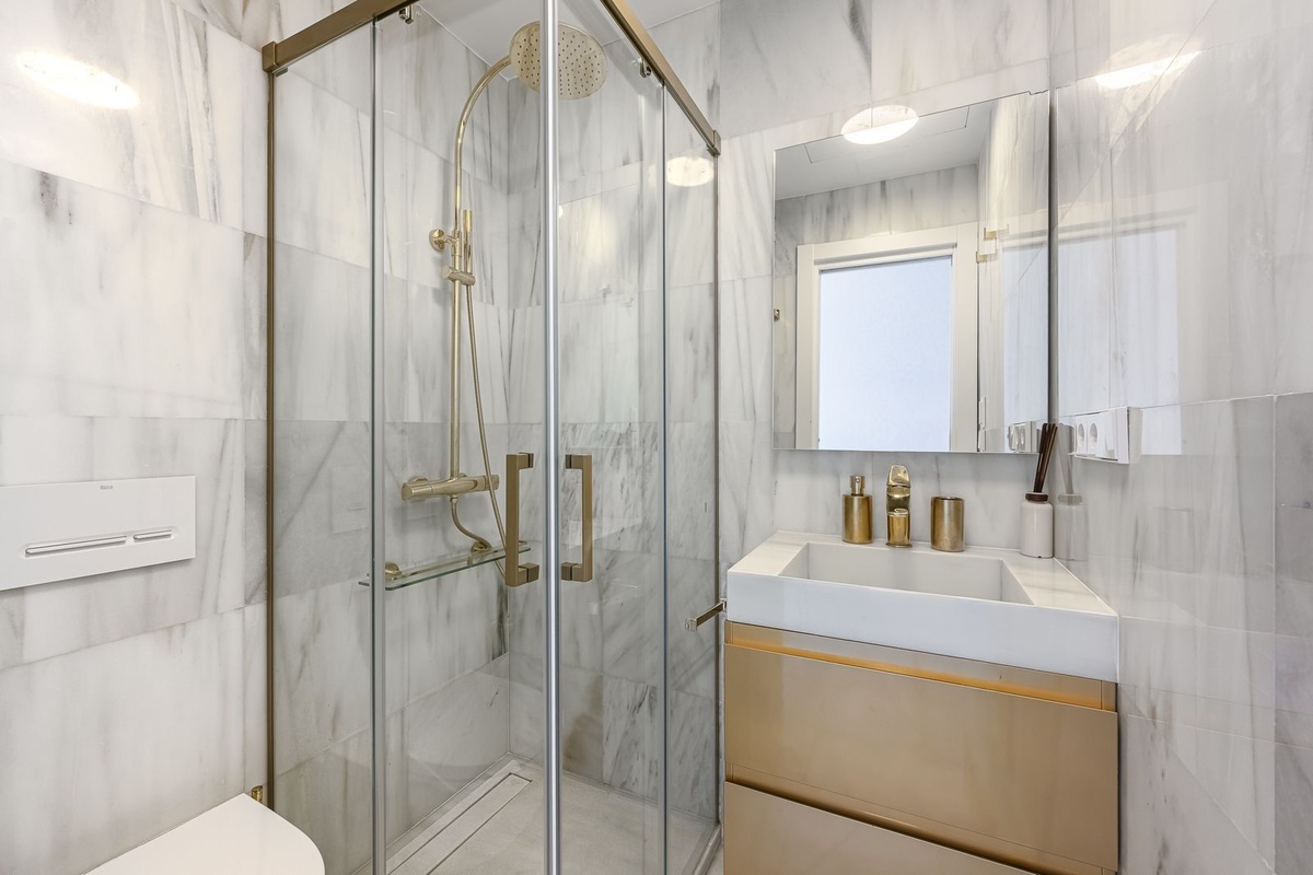 La propiedad dispone de dos dormitorios luminosos y dos baños completamente renovados en mármol, con duchas de cristal y grifería en acabado dorado que evocan el ambiente de un hotel boutique. Los suelos de mármol y la cuidada decoración aportan elegancia y sofisticación a cada estancia.